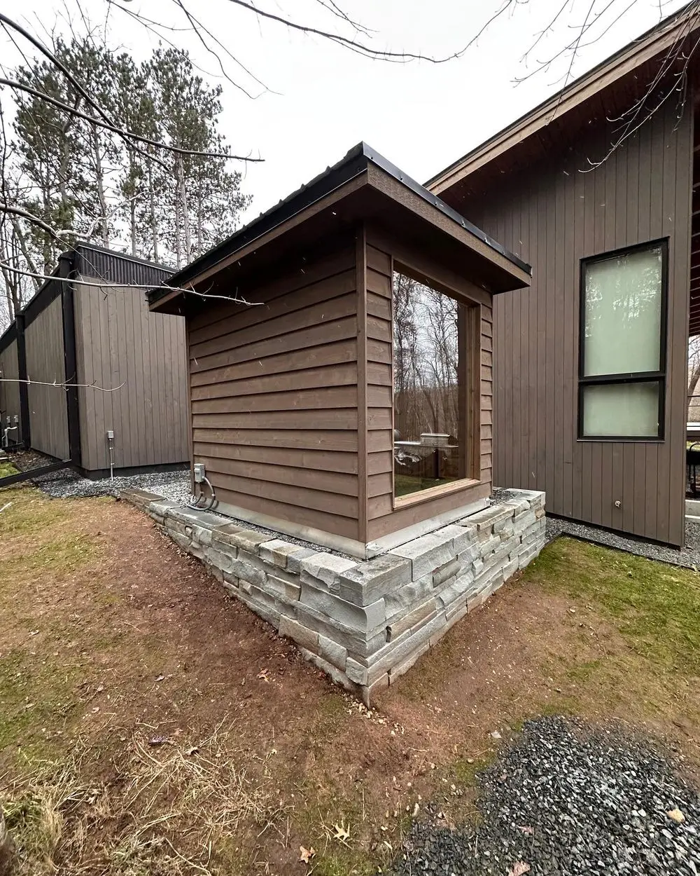 Beyond its practical benefits, the stone wall provides a timeless look that complements the modern architecture of the sauna and surrounding structures. Whether viewed up close or from afar, this addition transforms the space into a serene retreat.